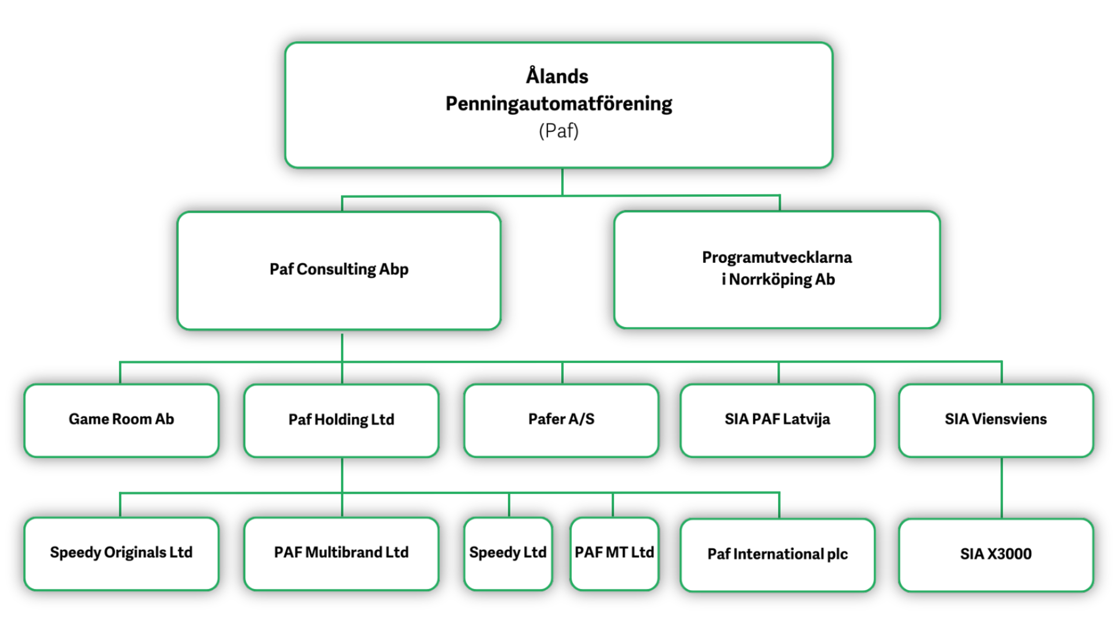 The following licensed gaming operations companies are included in the Paf Group; the parent company Ålands Penningautomatförening (Paf) and its subsidiaries Programutvecklarna i Norrköping, Paf Consulting Abp and Paf International Abp. Paf Consulting Abp is the owner of subsidiaries Game Room Ab, Pafer A/S, Paf Holding Ltd, SIA Paf Latvija and SIA Viensviens.