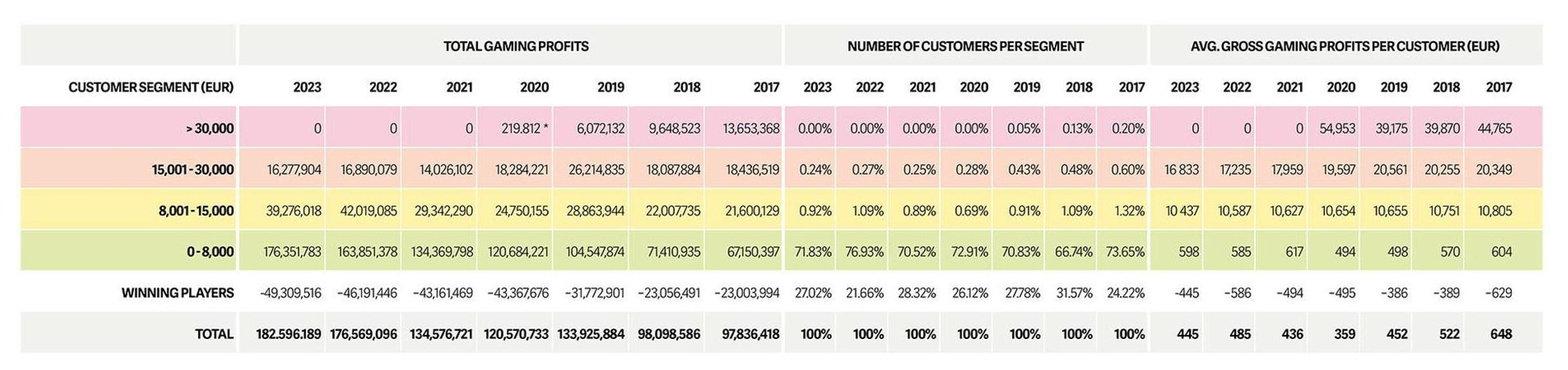 The published table shows the development of gaming in different customer segments from 2017 until 2023. The red segment for customers who have lost more than €30,000 in one year is at zero in recent years, as Paf’s loss limits stop large losses. The white segment shows the number of players who ended the year in profit.