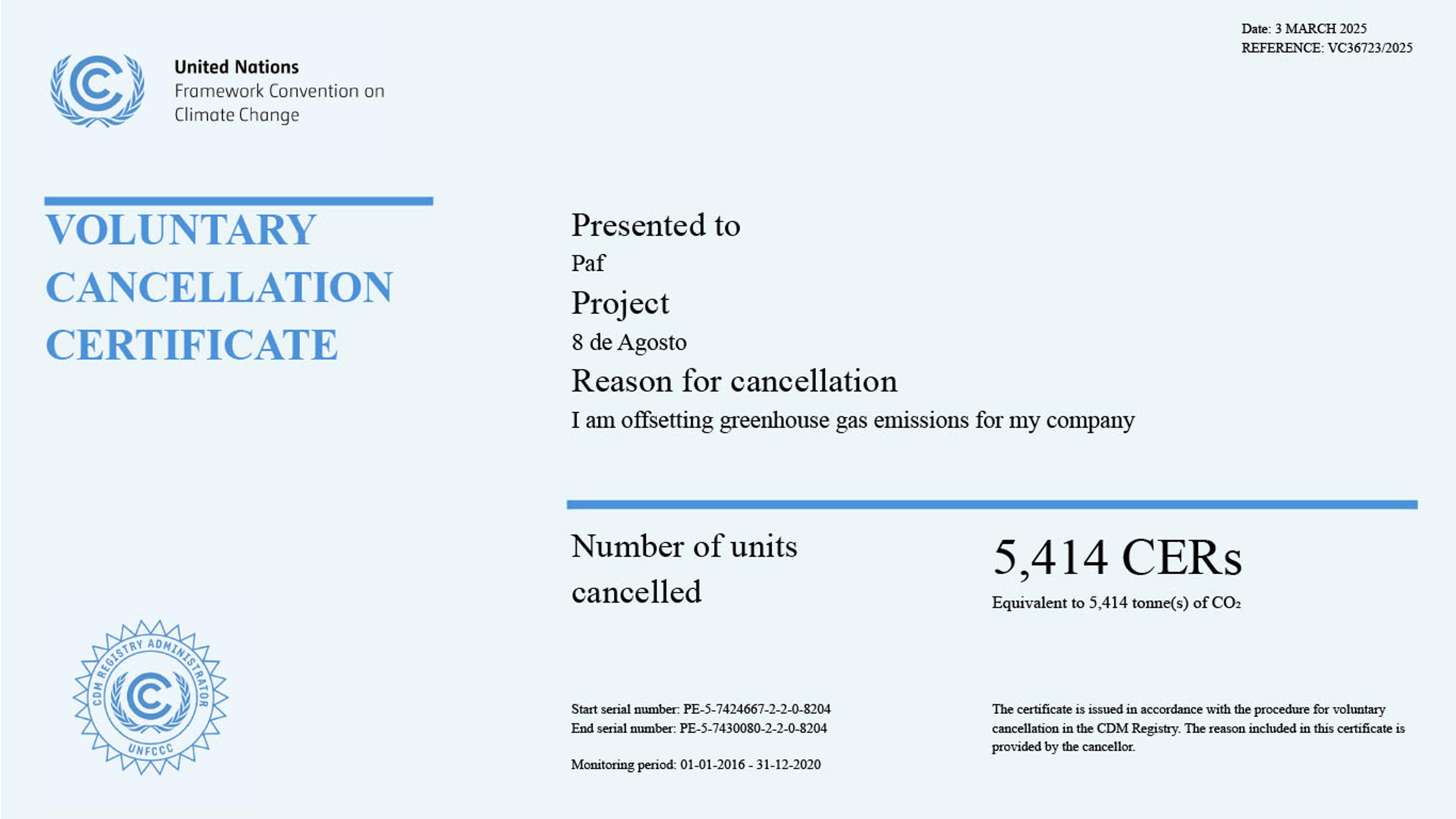 Climate financing (also known as climate offsetting) means that Paf funds certified climate projects that help reduce or capture greenhouse gases somewhere in the world. This could involve supporting renewable energy, energy efficiency, or reforestation projects in developing countries.