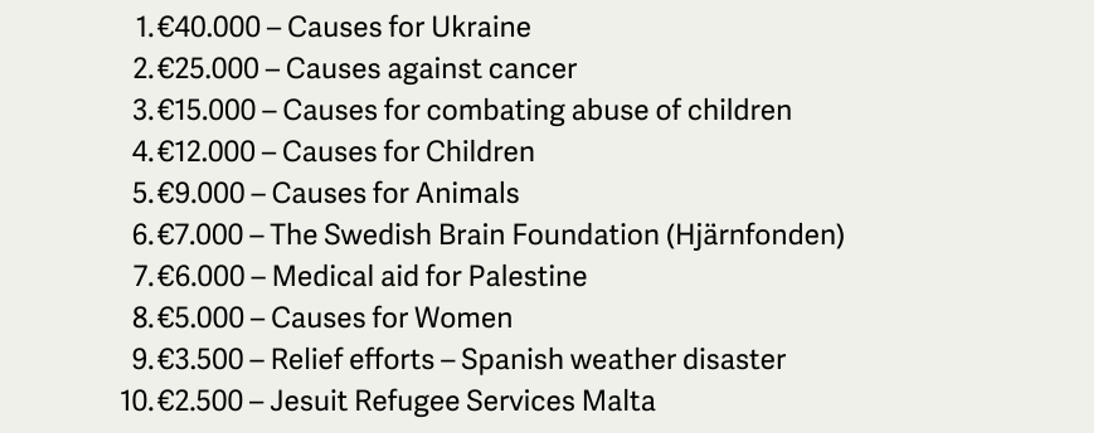 When the employees gathered in December for the annual Christmas speech, the vote was taken and the result determined how the €125,000 would be distributed. The Employee vote gave causes for Ukraine the biggest donation and €40,000, followed by causes against cancer €25,000 and in third place causes for combating abuse of children €15.000.