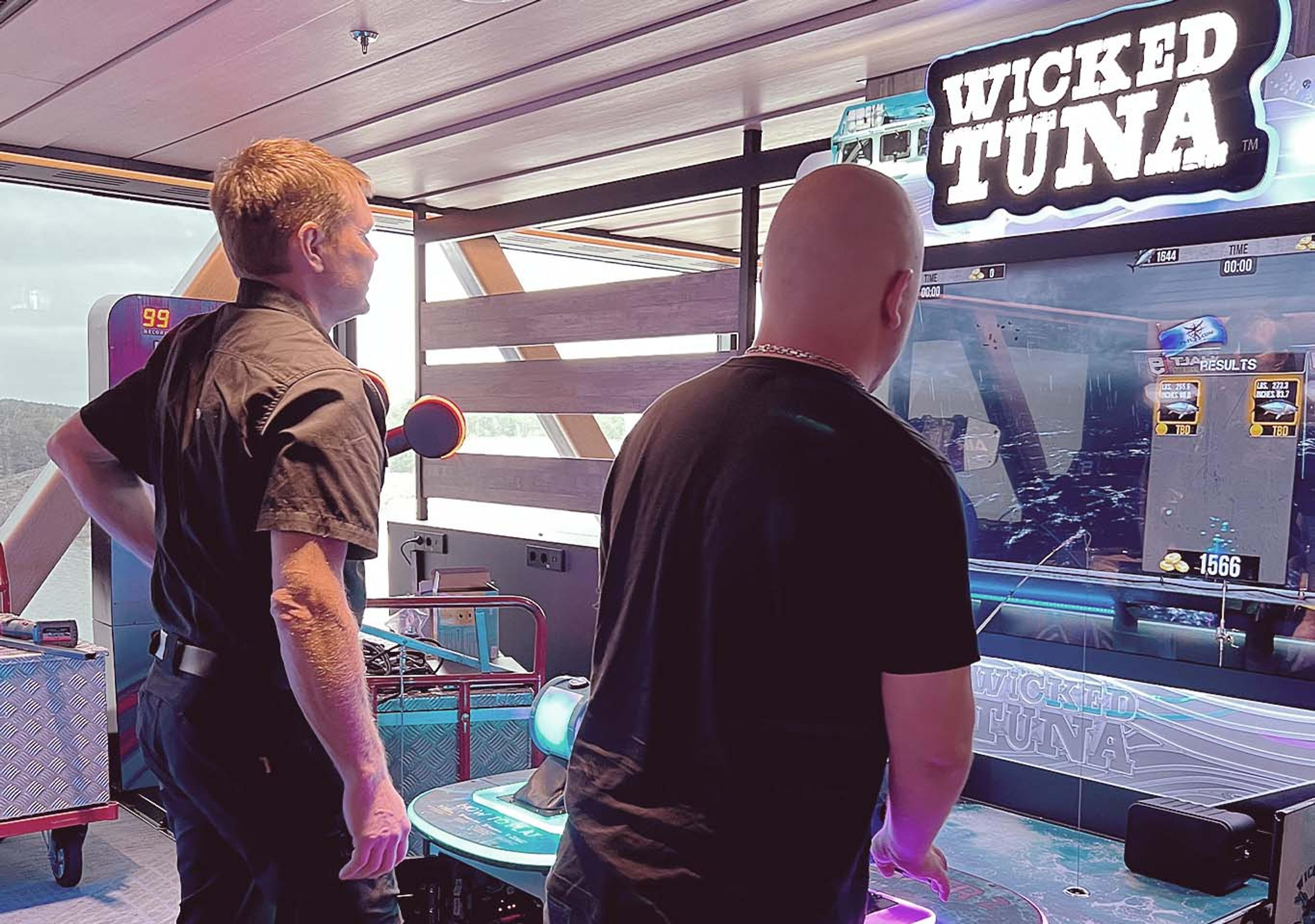 Paf’s servicemen installing and testing the new amusement game Wicked Tuna