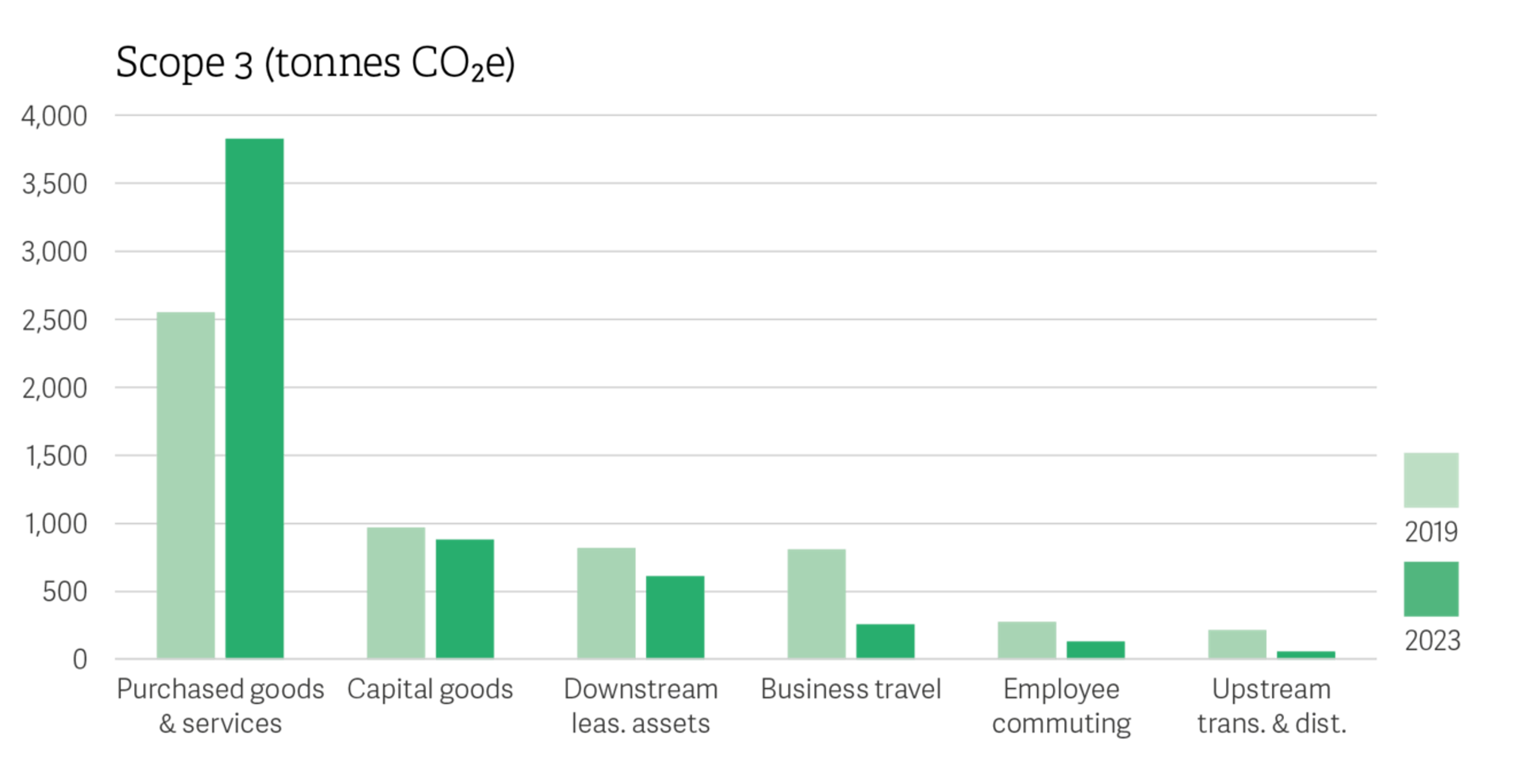 As in previous years, the largest share of our greenhouse gas emissions comes from scope 3, representing 98.7% of our total emissions. Scope 3 emissions increased by approximately 1.5% compared to the base year 2019.