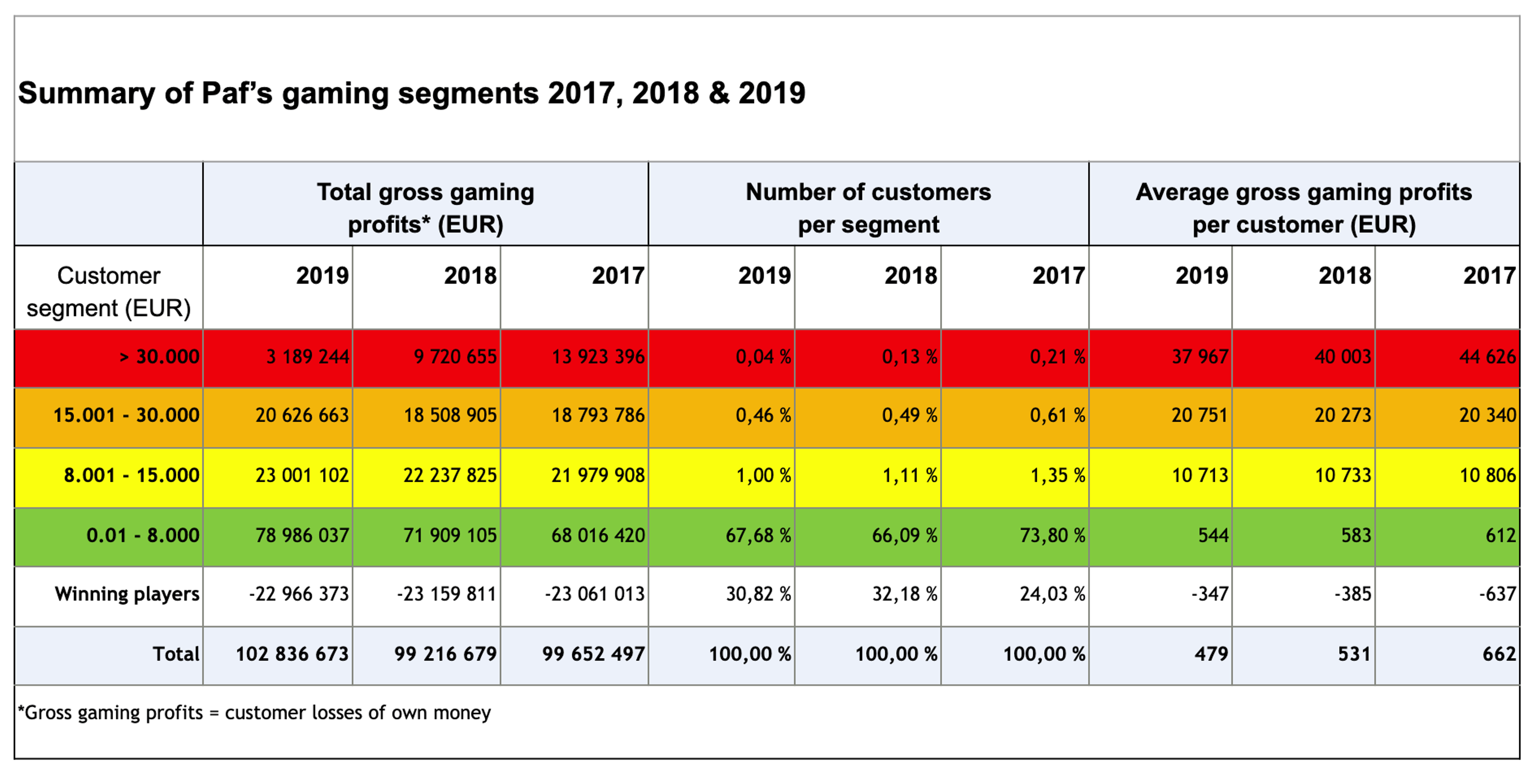 Last year Paf decided to openly publish its customer segments’ profits and losses – a unique initiative in the gaming industry. This year we keep our promise of continued openness (see the appendix).