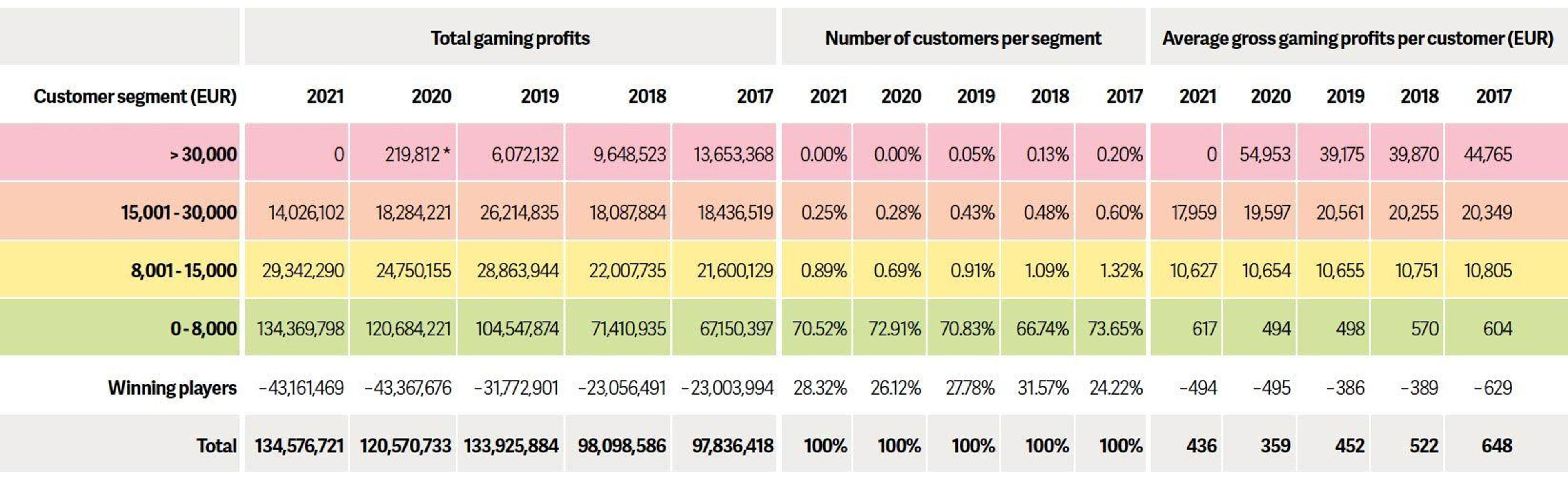 For the fourth year in a row, Paf has chosen to openly publish customer segments that reveal customers’ gaming losses and wins. The figures show that Paf has reduced its revenues from the orange segment by 23.3%, while at the same time revenues from the large green segment have increased by 11.3%.