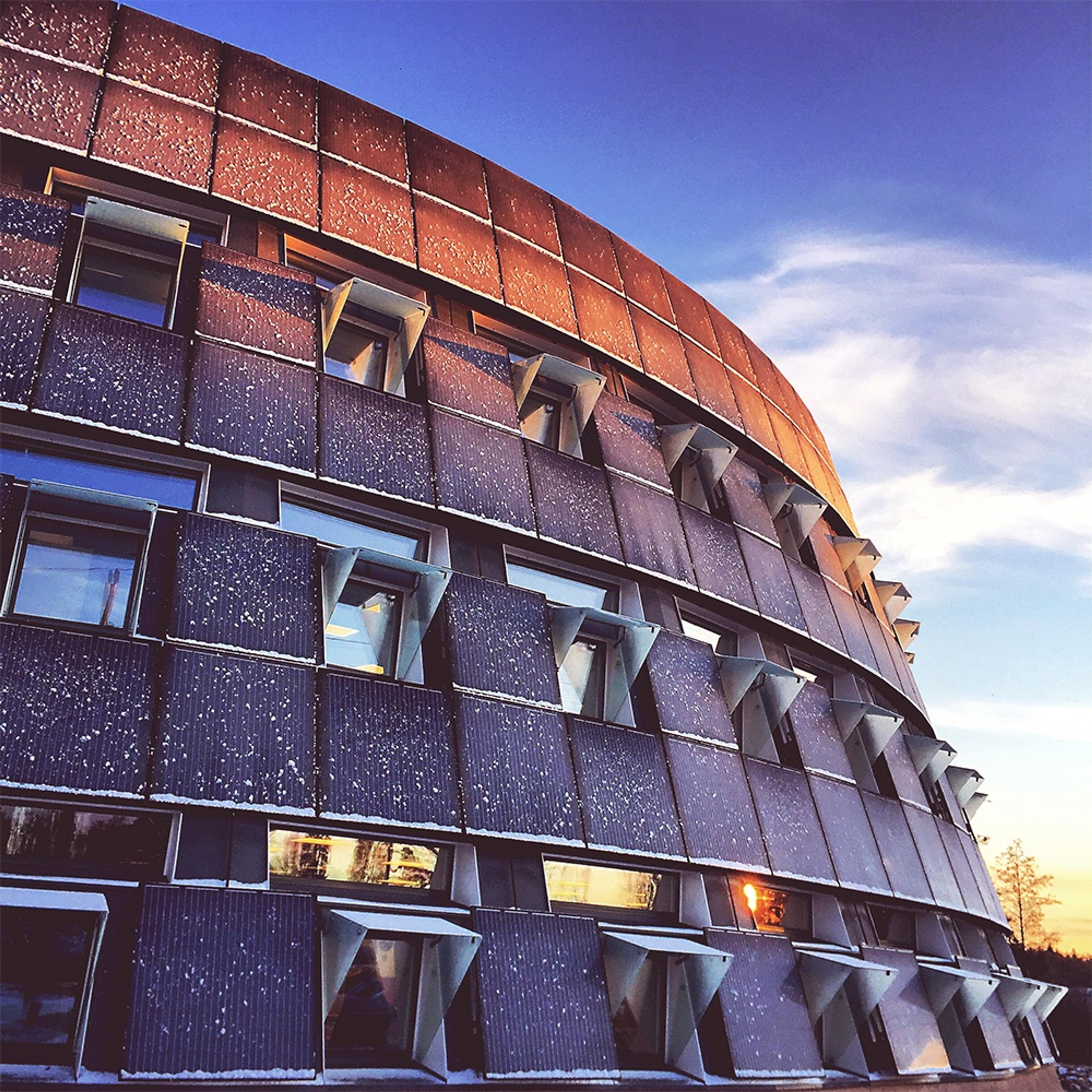 Large parts of the slanted, bow-shaped exterior walls of the building are covered by a special sealing layer that reduce heating emissions, and 742 solar panels collect daylight in order to generate energy for use inside the building.