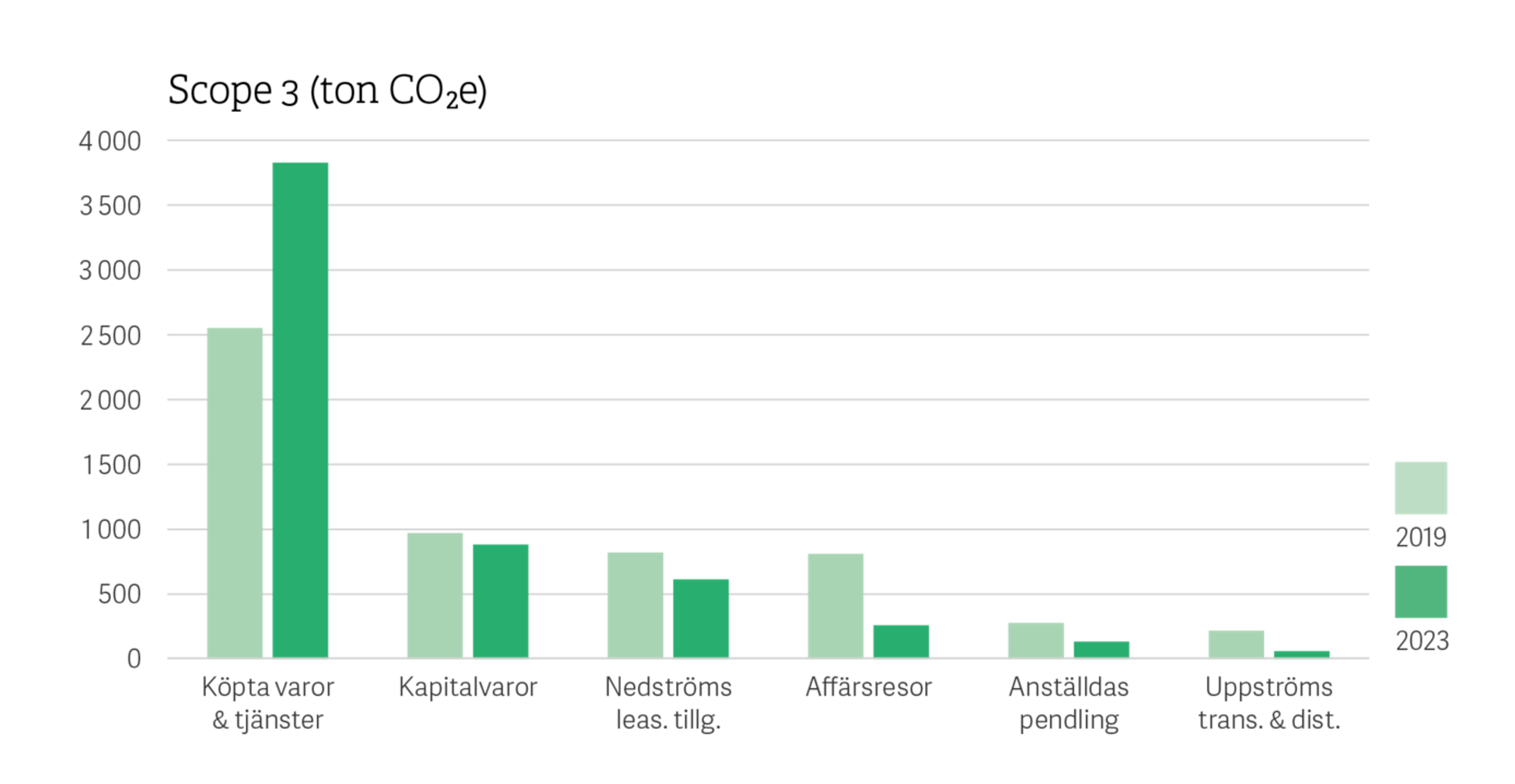 Liksom tidigare år kommer den största delen av våra växthusgasutsläpp från scope 3, vilket motsvarar 98,7% av våra totala utsläpp. Utsläppen i scope 3 ökade med ungefär 1,5% jämfört med basåret 2019.
