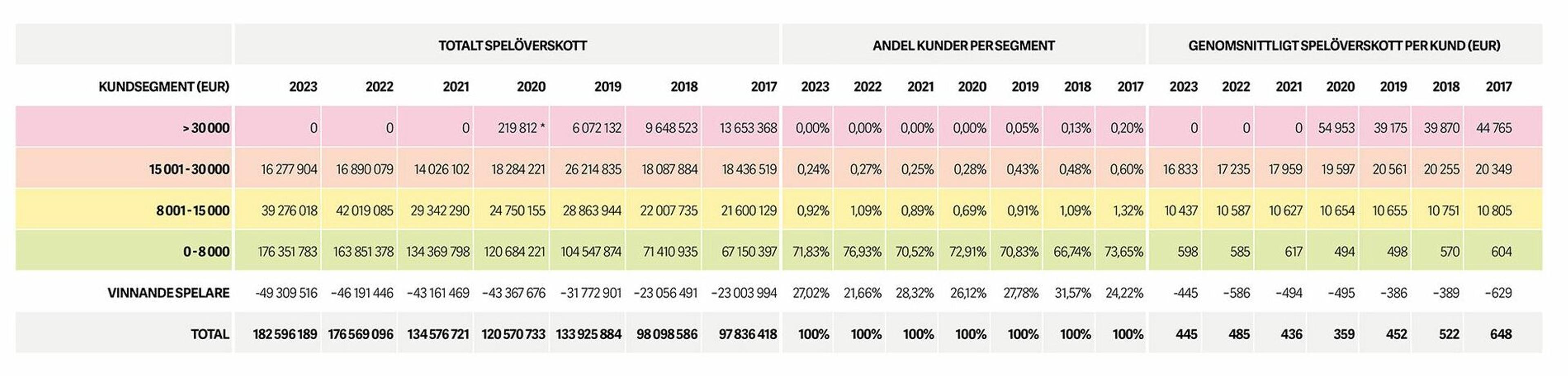 Tabellen visar utvecklingen av spelandet inom olika kundsegment från år 2017 och fram till 2023. Det röda segmentet för kunder som förlorat mer än 30 000 euro på ett år ligger på noll de senaste åren, eftersom Pafs förlustgränser stoppar stora förluster. Det vita segmentet visar antalet spelare som avslutat året på vinst.