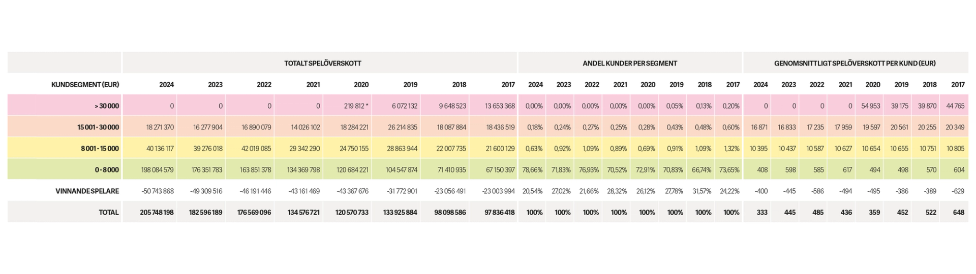 Tabellen visar utvecklingen av spelandet inom olika kundsegment från år 2017 och fram till 2024. Det röda segmentet ligger på noll de senaste åren, eftersom Pafs förlustgränser sätter stopp för större förluster. Det vita segmentet visar hur stor summa de vinnande kunderna avslutat året med. Den fullständiga tabellen finns tillgänglig inne i årsberättelsen och på våra sidor för spelansvar.