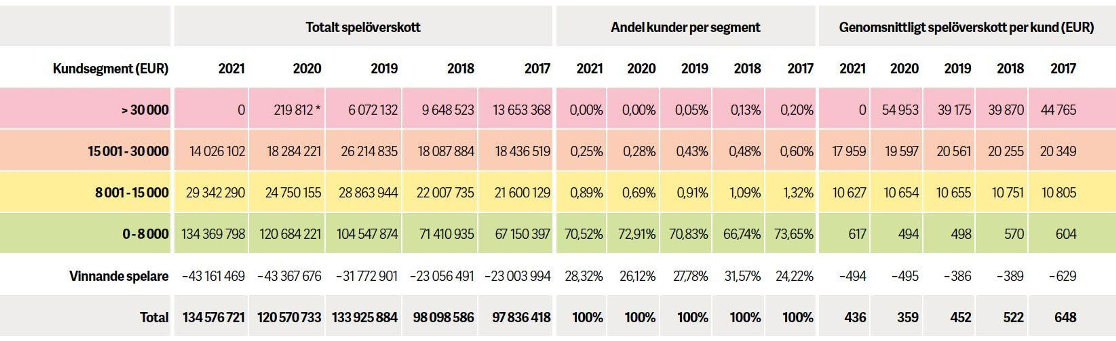 För fjärde året i följd väljer Paf att öppet redovisa kundsegmenten som innehåller siffrorna för kundernas förluster och vinster. Siffrorna visar att vi minskat intäkterna från det orange segmentet med 23,3% och på samma gång har intäkterna från det stora gröna segmentet ökat med 11,3%.