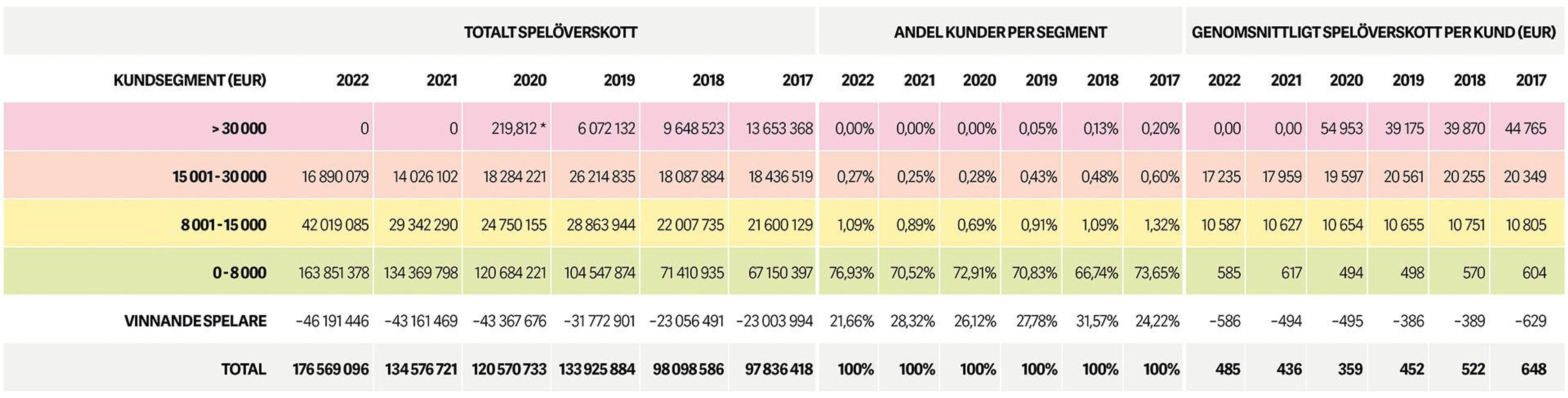 Vi tror på öppenhet och att det i längden gör Paf till ett trovärdigare spelbolag. Paf började öppet redovisa siffror för kundernas förluster och vinster redan för fem år sedan, år 2019. I årets tabell med Pafs kundsegment ingår numera siffrorna för de svenska Speedy bolagen i 2022 års kolumn.