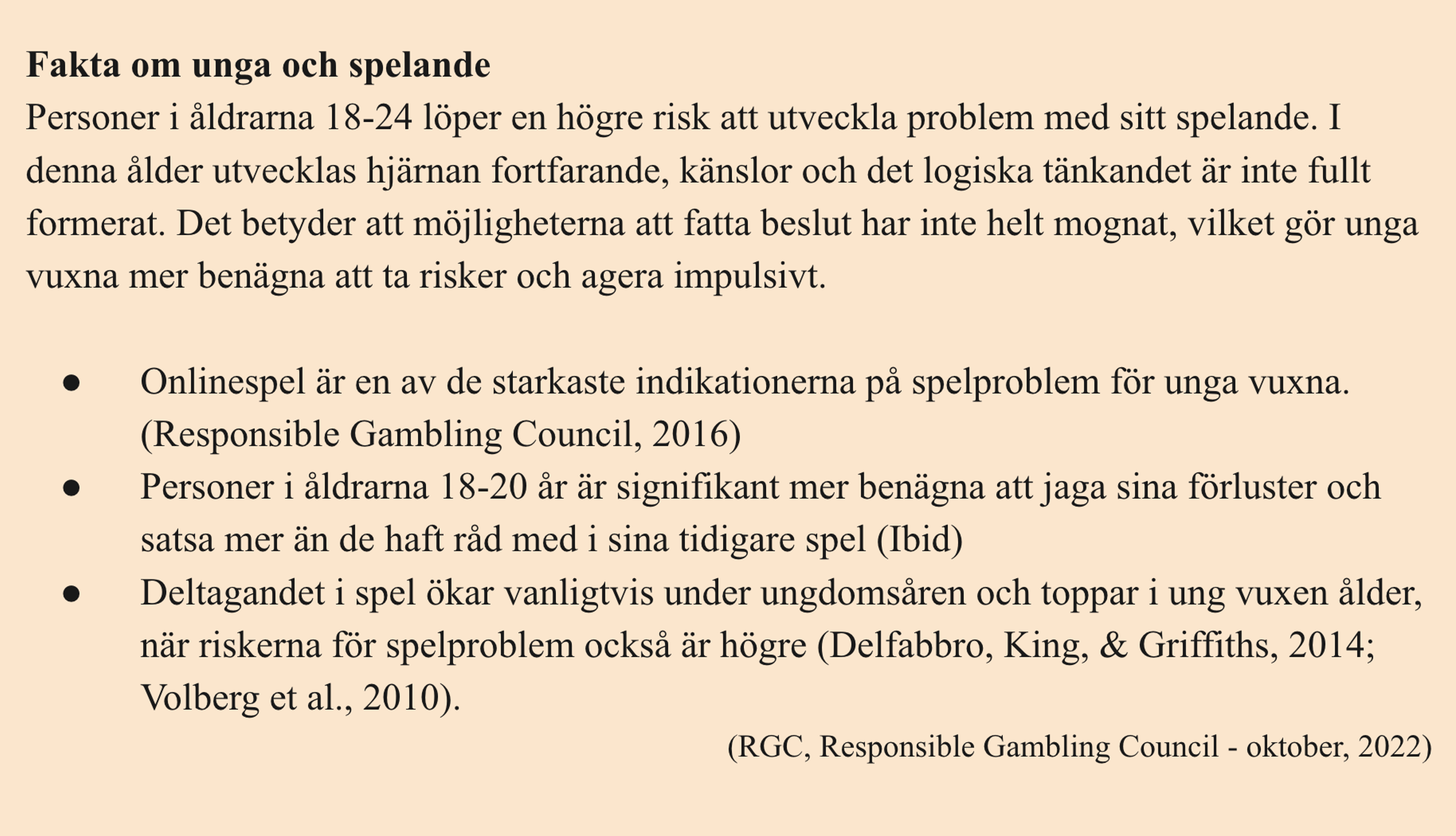 Forskningen kring spelproblem och olika riskgrupper indikerar generellt sett att unga personer utgör en riskgrupp.